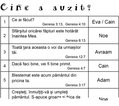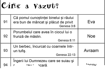 Poate fi jucat de două-patru persoane sau două-patru echipe. Jucătorii trebuie să recunoască un personaj din Biblie după cuvinte auzite sau după ce spune Biblia că a văzut personajul respectiv. Jucătorilor li se prezintă un verset biblic (sau un fragment de verset) care conține, de exemplu, cuvintele spuse unui personaj biblic. Într-un interval de timp stabilit dinainte, jucătorii trebuie să ridice cartonașul pe care se află scris numele personajului care a auzit acele cuvinte sau a văzut lucrurile scrise în versetul respectiv. Cutia conține: